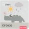 Le Livre d'éveil croco multicolore de chez Done By Deer. Chaque page du livre est dédiée à une saison différente (printemps, été, automne, hiver), illustrée avec des éléments et des couleurs caractéristiques de cette période.