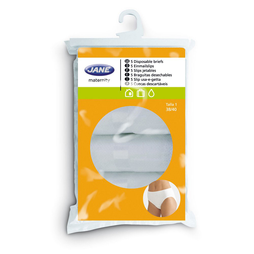 Le Lot de 5 slips jetables blanc taille 46-48 de chez Jané. Les lots de slips jetables sont très pratiques pour votre séjour en maternité. Ils sont réalisés dans un non tissé très doux et anallergique qui vous garantit un confort sain. Les élastiques des coutures sont enrobés de fils afin d’éviter tout risque d’irritation.