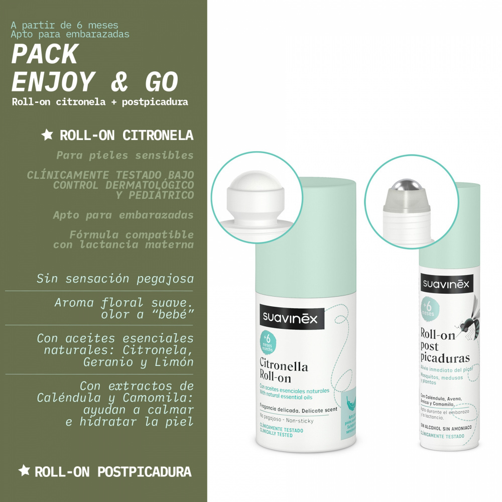 Ce Pack anti-moustique roll-on citronnelle de la marque Suavinex réunit deux indispensables pour protéger et soulager toute la famille durant l’été : un spray à la citronnelle et un roll-on après pique, présentés dans une trousse compacte avec attache pratique. Le spray diffuse un mélange naturel d’huiles essentielles de citronnelle, géranium et citron pour éloigner efficacement moustiques et insectes, tout en respectant les peaux sensibles grâce aux extraits apaisants de calendula et camomille. Le roll-on calme rapidement les démangeaisons et irritations causées par les piqûres d’insectes, méduses ou plantes, grâce à un cocktail d’extraits naturels de calendula, géranium, arnica et camomille. Sans alcool ni ammoniaque, ces produits sont sûrs pour les enfants dès 6 mois.