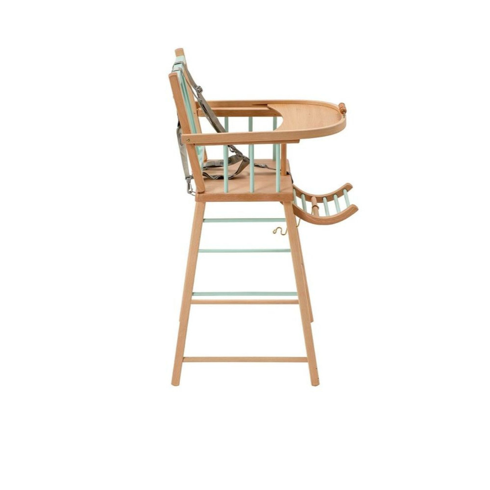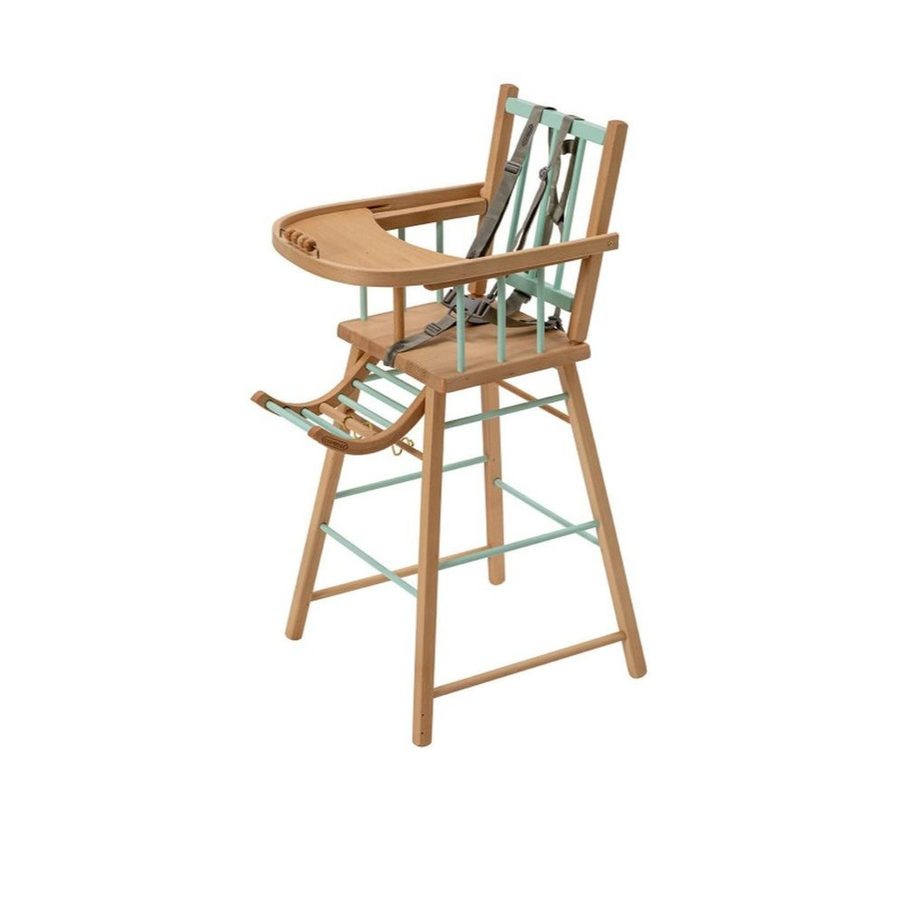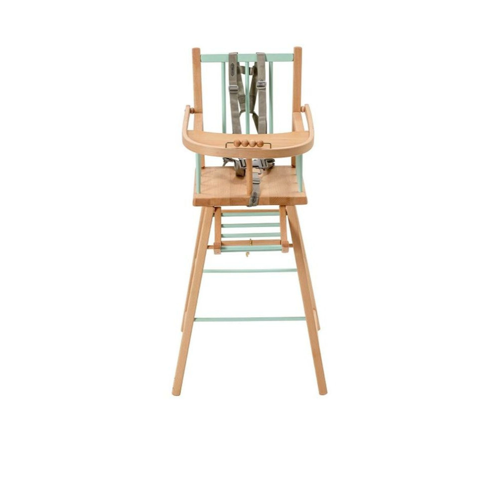 Pack chaise haute andré hybride vert mint et sa tablette blanche de la marque Combelle. Ce pack est composé de la chaise haute André et de sa tablette blanche amovible.