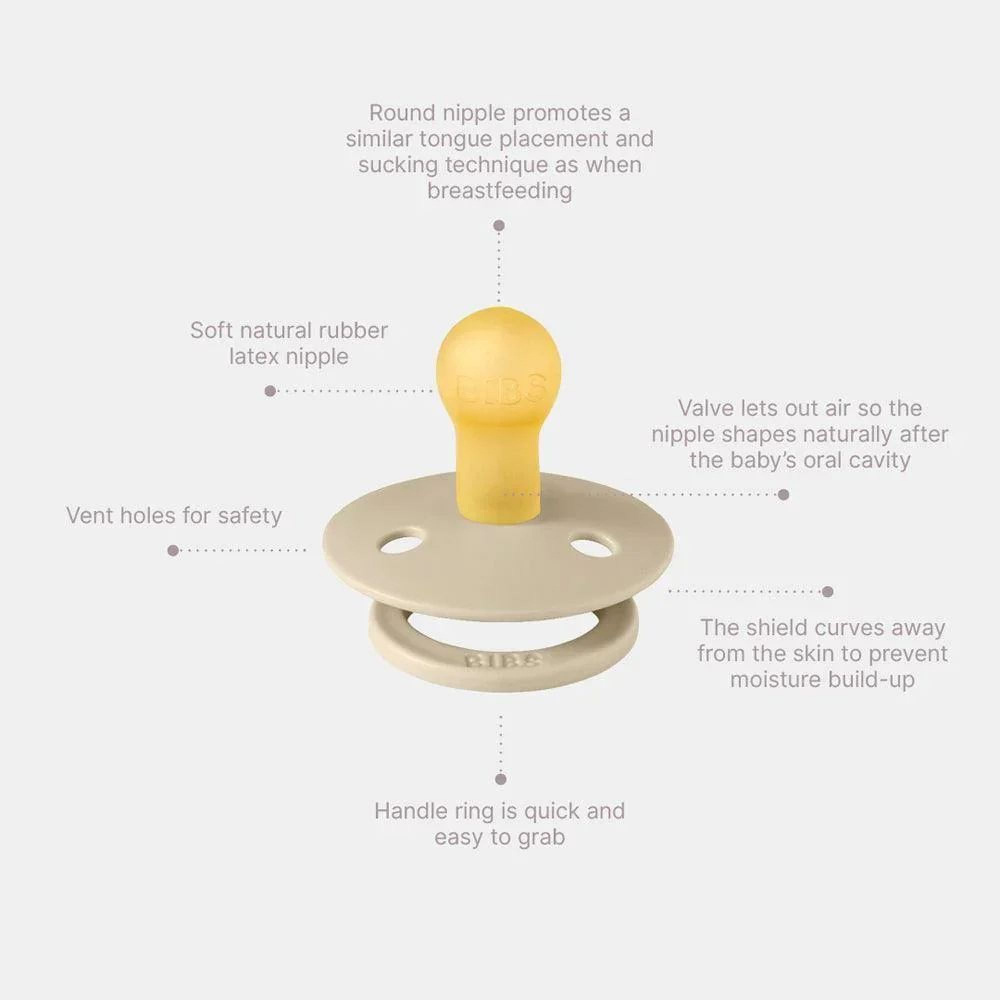 Les deux sucettes Bib's taille 1 (de 0 à 6 mois) possèdent chacune une tétine différente : l'une en latex de caoutchouc naturel et l'autre en silicone. Les tétines sont orthodontiques, c'est-à-dire qu'elles vont s'adapter naturellement au palais de votre bébé. L'extrémité des tétines est incurvée pour faciliter le placement de la langue.