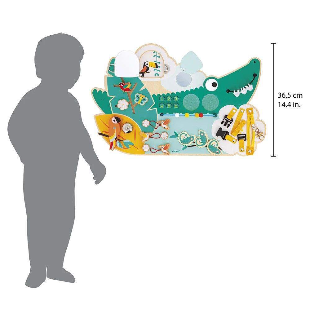 Panneau d'activités en bois busy board crocodile tropik de la marque Janod. Avec ce busy board, ce sont des longues heures de jeu et d'amusement que va avoir votre enfant. Il peut se fixer au mur de la chambre de votre enfant ou alors se poser au sol. Il y a 14 activités différentes sur ce panneau : 1 labyrinthe avec 3 éléments à manipuler, 1 œil rotatif sonore, 3 sangles avec différents systèmes de fermeture (fermeture éclair, scratch, plastique), 3 engrenages caméléons, 1 sonnette, 1 serrure métallique, 1 miroir caché, 1 boulier avec des billes colorées, des textures en silicone et en feutrine à toucher, des boutons à pousser, des élastiques à attacher.