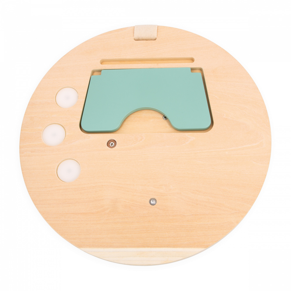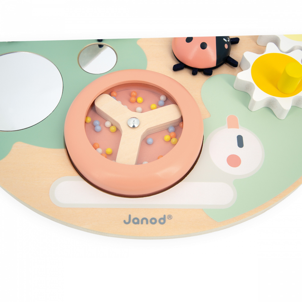 Panneau d'activités sweet cocoon de la marque Janod. Vous trouverez sur ce panneau 7 activités : 3 engrenages en forme de de marguerites à faire tourner, 1 boulier, 1 coccinelle qui se visse et se dévisse, 1 abeille qui fait cric-cric quand on la tourne, 1 escargot dont la coquille tourbe et fait retentir les perles multicolores à l'intérieur, et 3 miroirs de tailles différentes dont 1 qui est caché sous une feuille. Ce panneau est équipé d'un pied pour pouvoir mettre le jeu dans la meilleure position pour votre enfant. Vous pourrez aussi utiliser ce panneau à plat et l'accrocher avec le scratch. Ce jeu d'éveil permet de développer la motricité fine et la dextérité.