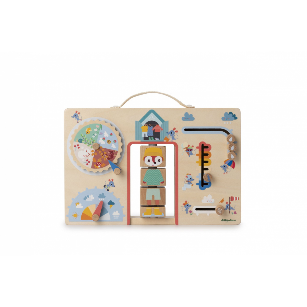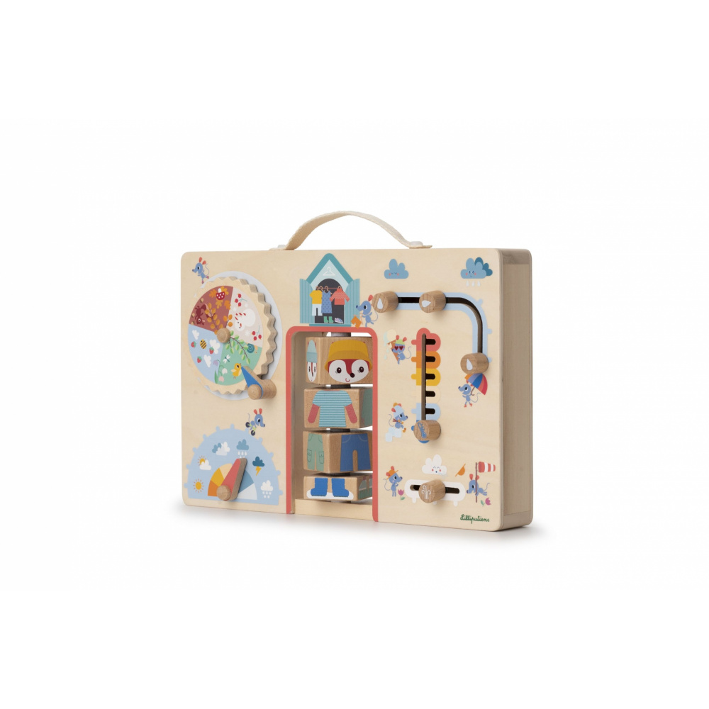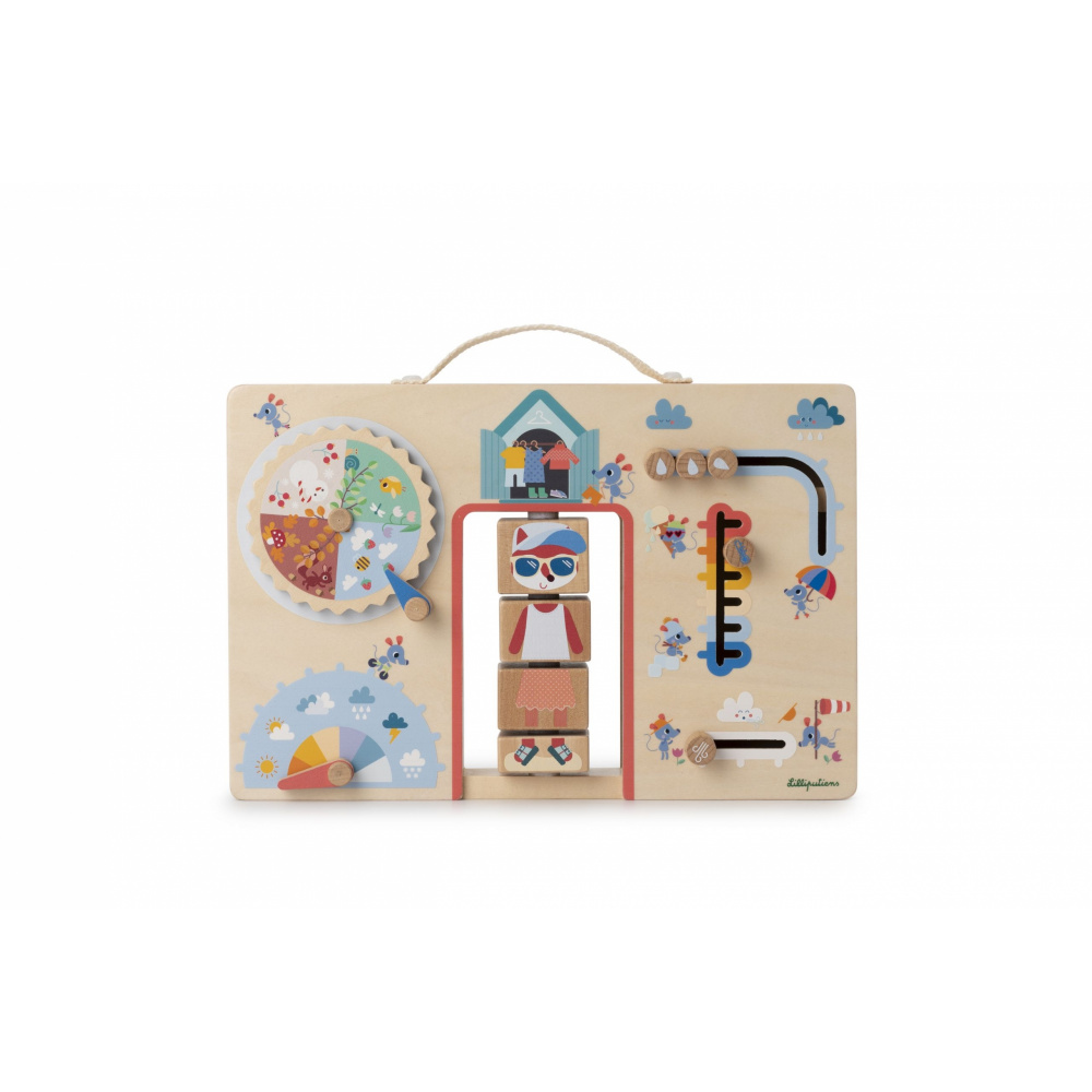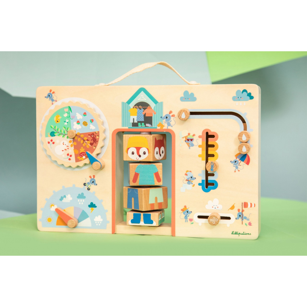 Panneau d'activités valisette alice s'habille selon la météo de la marque Lilliputiens. Votre enfant va adorer les 6 activités d'éveil sur ce panneau en bois sur le thème de la météo et des saisons. Il manipulera les 4 cubes en bois pour choisir la bonne tenue d'Alice. Ce produit développe la motricité fine.