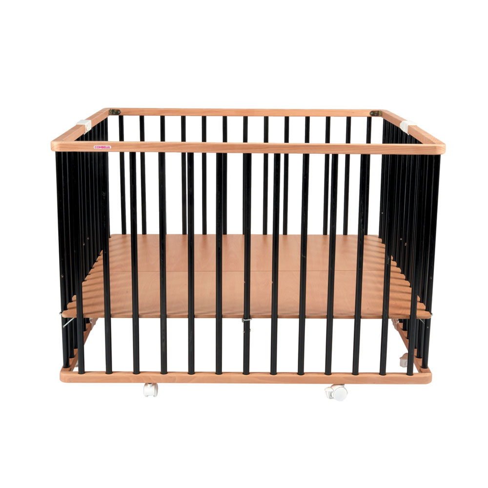 Parc carré pliant avec son plancher réglable sur 3 hauteurs et ses 8 roulettes pivotantes avec frein (incluses), Gaby allie tradition et innovation.