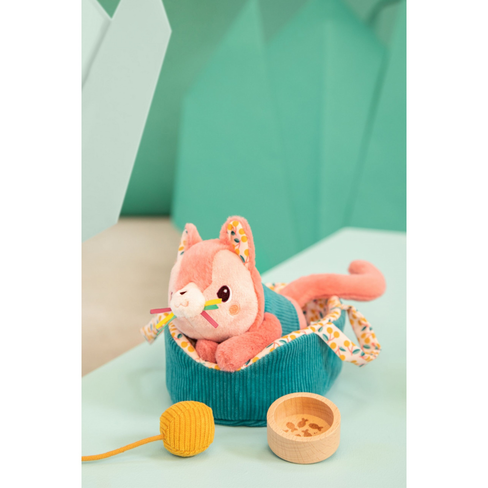 Peluche jeanne le chat et son panier de la marque Lilliputiens. Cette peluche toute mignonne fera office de premier animal de compagnie pour votre enfant. Il s'en occupera comme si c'était un vrai animal. La peluche est livrée avec 4 accessoires dont un panier et une gamelle pour bien s'en occuper. Sur le panier, il y a deux poignées pour le transporter partout.