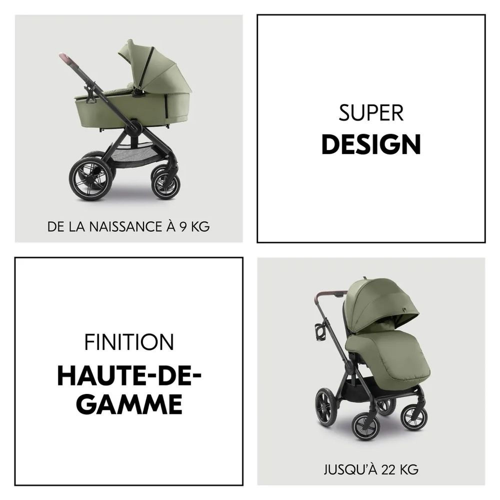 Choisissez le Poussette comfort n care olive de la marque Hauck. Ce set comprend une nacelle confortable et utilisable avec la nacelle ou en poussette et vous permet de débuter avec les éléments nécessaires pour l'arrivée de votre bébé à la maison. Avec son superbe design et sa qualité de matériaux et fintion , ce pack premium accompagnera durablement votre enfant , de la naissance à 22 kg . Grâce aux pneus en caoutchouc tout-terrain,la quadruple suspension et le harnais 5 points offre confort quelles que soient les conditions . Le pare-soleil XL extensible (UPF 50+) protège bébé et les fenêtres en filet assurent la ventilation. Avec un porte-gobelet, et vos affaires tiennent dans le panier ! Clipsez le siège pour bébé sur la poussette avec l’adaptateur fourni. Idéal pour le siège auto Drive N Care hauck et d’autres modèles.