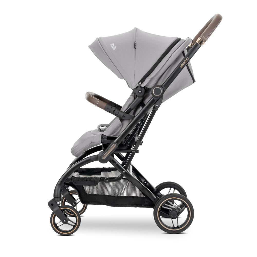 Elle dispose d’un dossier multi-positions avec plusieurs inclinaisons possibles pour un confort optimal, ainsi que d’un repose-jambes ajustable. Le châssis en aluminium garantit légèreté et robustesse. La poussette est équipée de roues avant pivotantes pour une maniabilité accrue dans les espaces étroits.