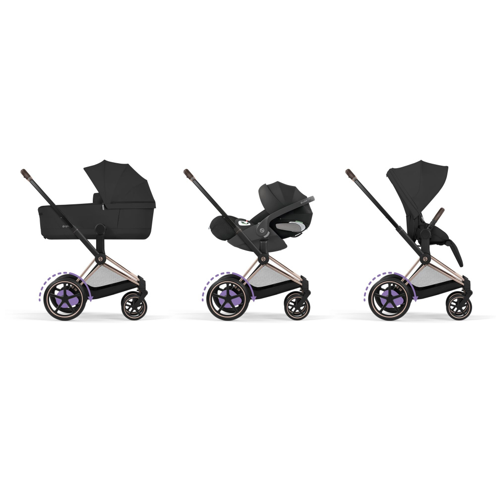 Les caractéristiques de la Poussette duo électrique e-priam 3 avec nacelle pliable châssis rosegold sepia black :