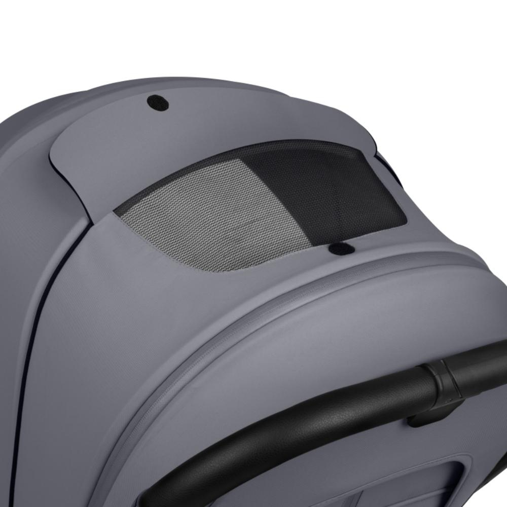 La poussette se distingue par ses roues tout-terrain sans entretien (20 cm à l’avant, 27 cm à l’arrière), son amortissement efficace et son centre de gravité bas, garantissant une excellente maniabilité sur tous types de surfaces. Le système de ventilation panoramique 3D de la nacelle, avec ouvertures sur l’auvent et l’avant, et le matelas AiryDots à canaux de ventilation, assurent une circulation d’air optimale et limitent la transpiration de l’enfant. La housse de matelas est en coton naturel.