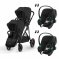 Composée de la poussette Gazelle S, l'assise supplémentaire, deux sièges auto Aton B2 i-Size et les deux adaptateurs.