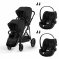 Composée de la poussette Gazelle S, l'assise supplémentaire, deux sièges auto Cloud G i-Size et les deux adaptateurs.