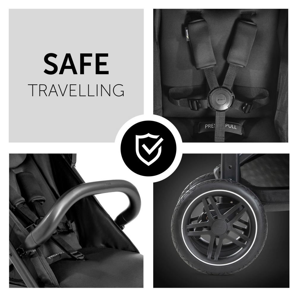 La Poussette rapid 4d black de chez Hauck. Elle sera parfaite pour promener bébé dans les meilleures conditions à la campagne ou en ville. Agiles et légères, ses roues pivotantes à 360° sont parfaites pour faire passer des moments agéables à votre enfant lors de ses promenades. La poussette Rapid 4D assure la sécurité et le confort de votre bébé. Votre bébé sera confortablement installé dans sa poussette, et solidement attaché grâce à un harnais 5 points. La barre de protection est amovible pour permettre l'installation rapide de votre enfant. Les lignes blanches sur les roues assurent la visibilité dans l'obscurité.