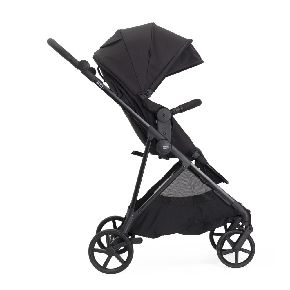 Le Poussette seety² ebony de chez Chicco . La poussette légère et compacte est conçue pour une utilisation dès la naissance jusqu'à 22 kg. Elle est dotée d'un siège réversible qui peut être orienté vers les parents ou vers le monde, et d'un dossier inclinable en plusieurs positions pour plus de confort. La poussette Seety est également livrée avec une housse de pluie.