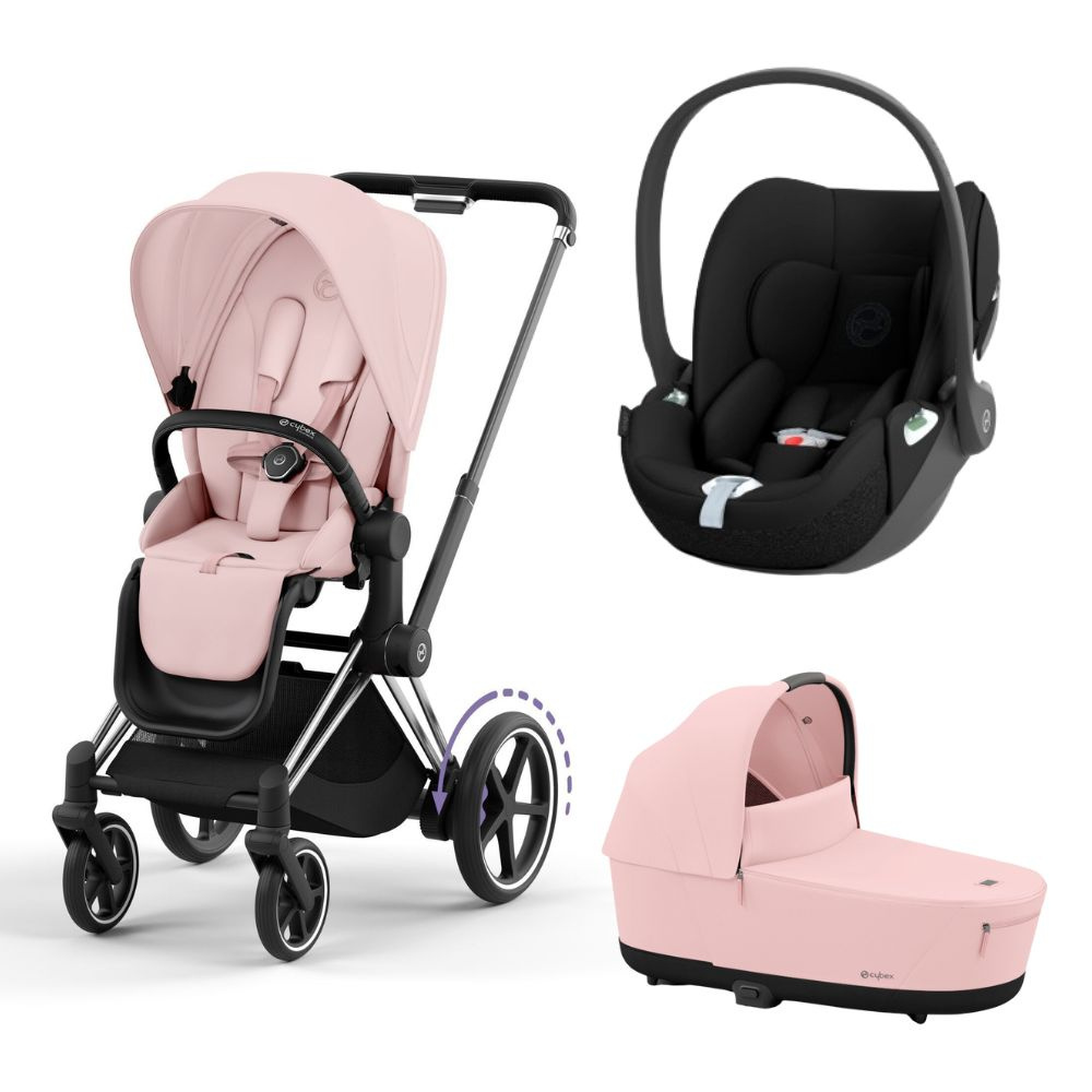 Adoptez la Poussette trio e-priam 2 peach pink châssis chrome black + cloud t i-size + nacelle de la marque Cybex. Composée de la poussette e-Priam 2, du siège auto Cloud T i-Size et de la Nacelle Luxe.