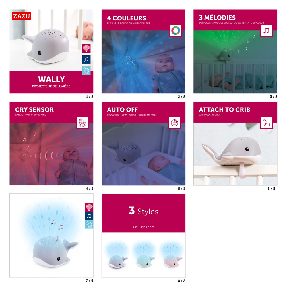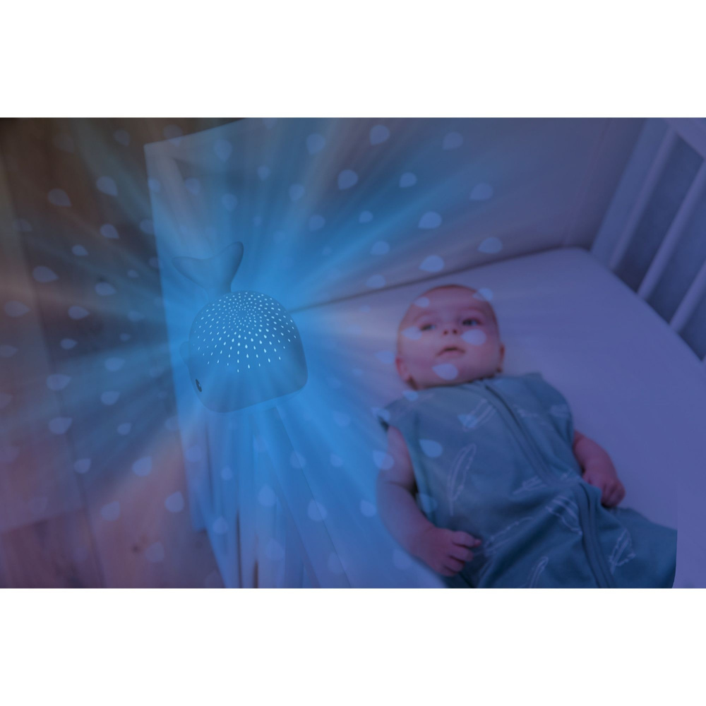 Wally la baleine Zazu, veilleuse projecteur avec lumières colorées et sons sous-marins pour apaiser bébé dès la naissance. La veilleuse Zazu Wally la baleine crée une ambiance océan apaisante avec ses lumières colorées (rouge, bleu, vert ou multicolore) projetées au plafond. Elle diffuse également des sons sous-marins pour accompagner bébé vers le sommeil. Pratique, elle s’éteint automatiquement après 20 ou 40 minutes. Utilisable dès la naissance.