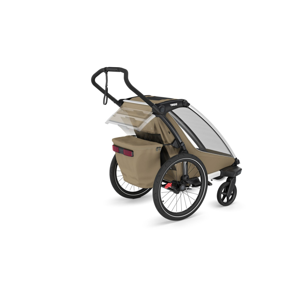 Remorque pour vélo chariot cross 1 faded khaki de la marque Thule. Cette remorque est très pratique et vous propose plusieurs modes d'usage : mode jogging (nécessite un kit, mode marche, remorque de vélo et mode ski (nécessite un kit). Il est très simple et rapide de passer d'un usage à un autre grâce au système FlipWing. Le Thule Clik n'Store vous permet de ranger tous les kits et de les emporter avec vous. Le produit est conçu pour un usage au quotidien. L'habitacle est bien aéré pour le confort de votre enfant. Le Chariot Cross est équipé d'un grand espace de rangement.