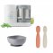 Ce pack contient le robot Babycook Néo Grey/White ainsi qu'un lot de 2 pré-cuillères en silicone Terracotta/Velvet grey et un bol en silicone à ventouse Grey. Tout le nécessaire pour préparer et donner les premiers repas à votre bébé!