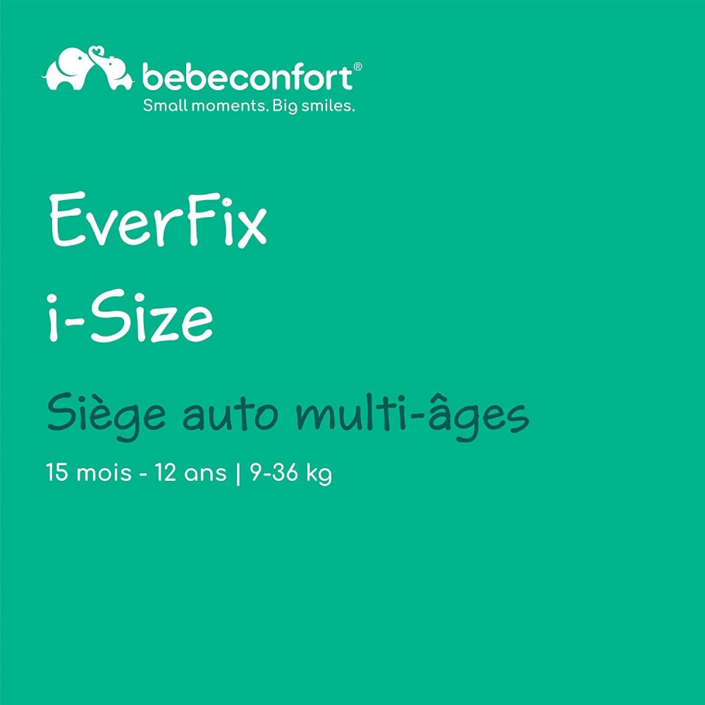 Le Siège auto everfix tinted black de chez Bebeconfort. Installez le siège-auto EverFix i-Size en mode harnais de 76 à 105 cm puis en mode rehausseur de 100 à 150 cm. le siège auto répond au dernière norme i-size. Equipez du système Isofix et d'une sangle Top Tether. Ce siège accompagnera votre enfant de 15 mois à 12 ans (76-150 cm)