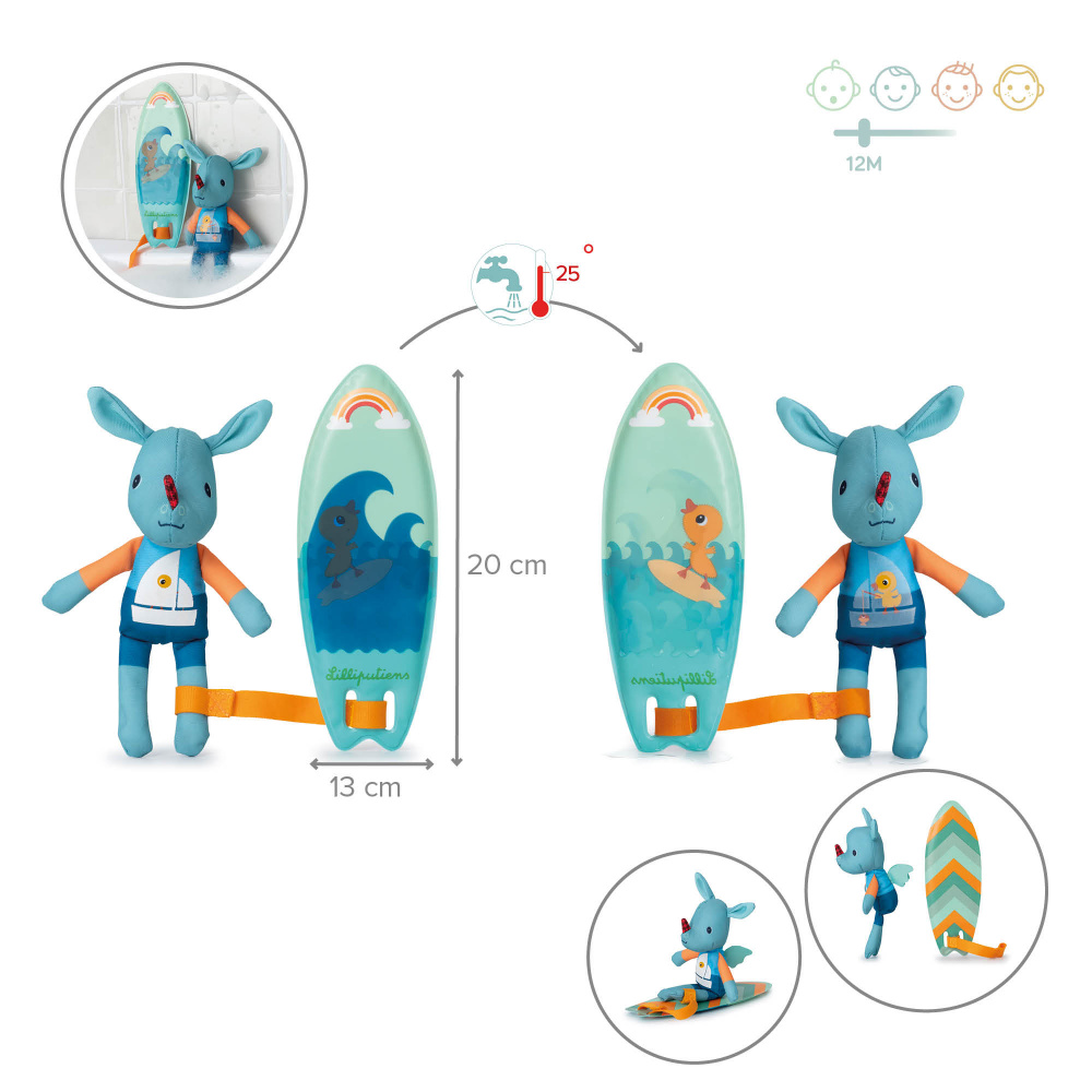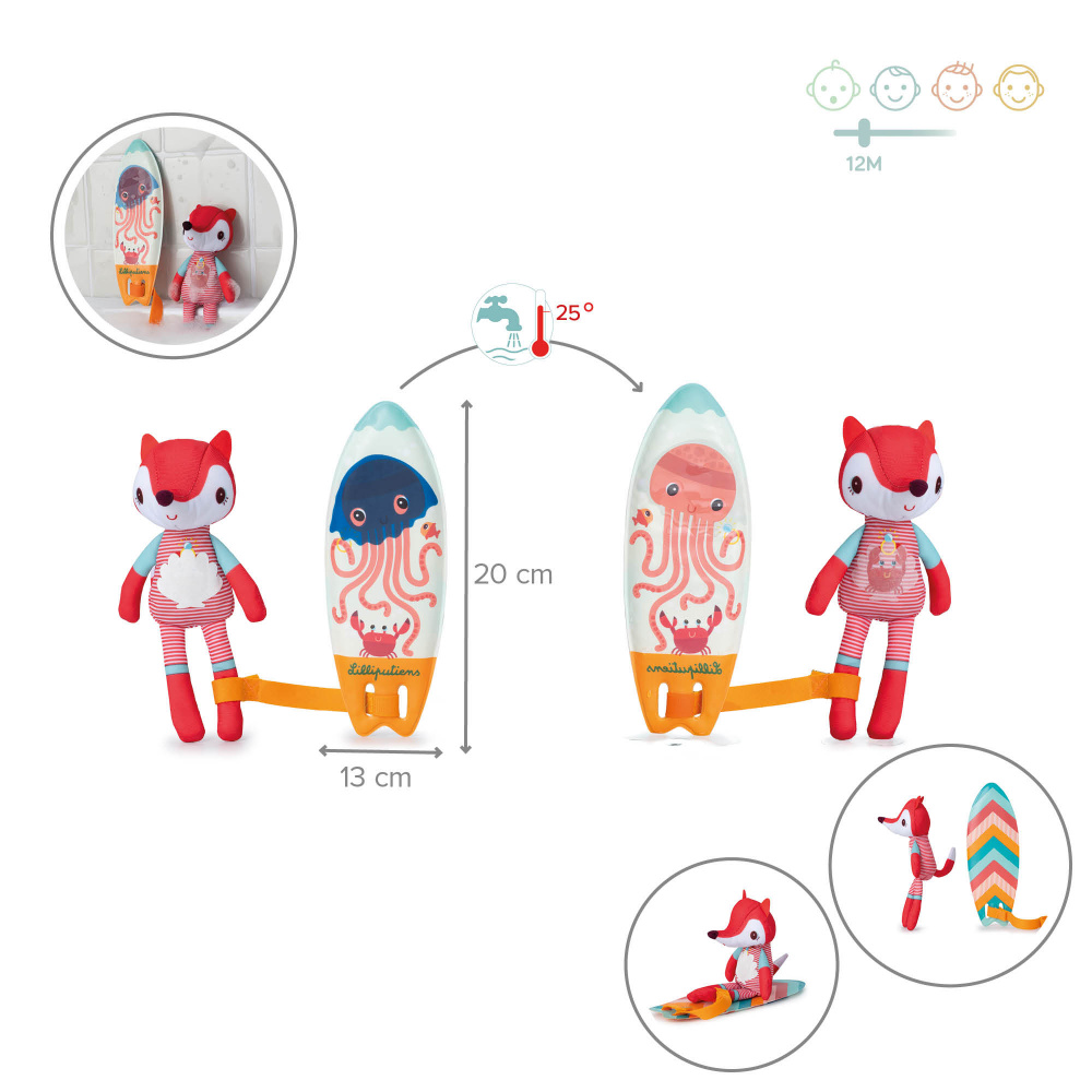Jouet de bain alice la surfeuse magique de la marque Lilliputiens. Lorsque votre enfant plongera ce jouet de bain dans l'eau de son bain à 25°, des dessins apparaîtront sur la combinaison du personnage et sur la planche de surf. Votre bébé va s'amuser à faire surfer le personnage sur les vagues de l'eau du bain. Ce jouet est très facile à manipuler par les petites mains de votre bébé.