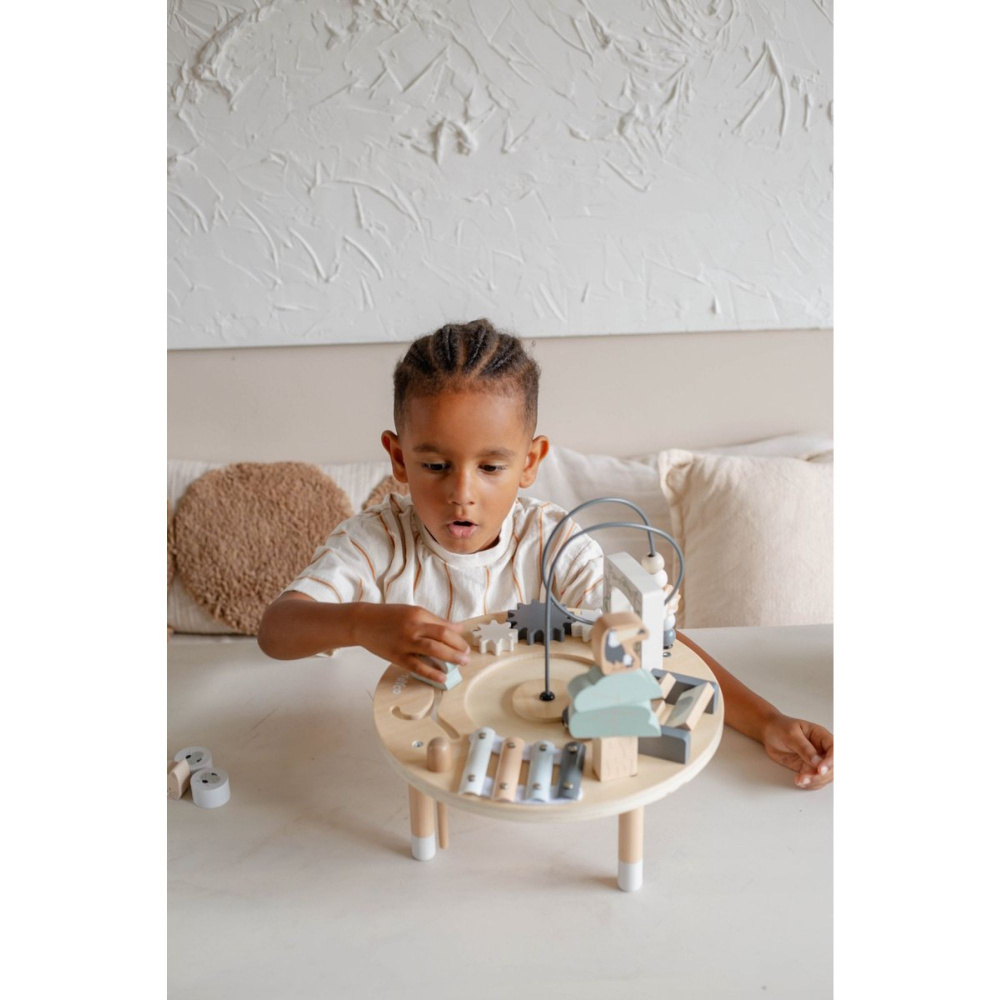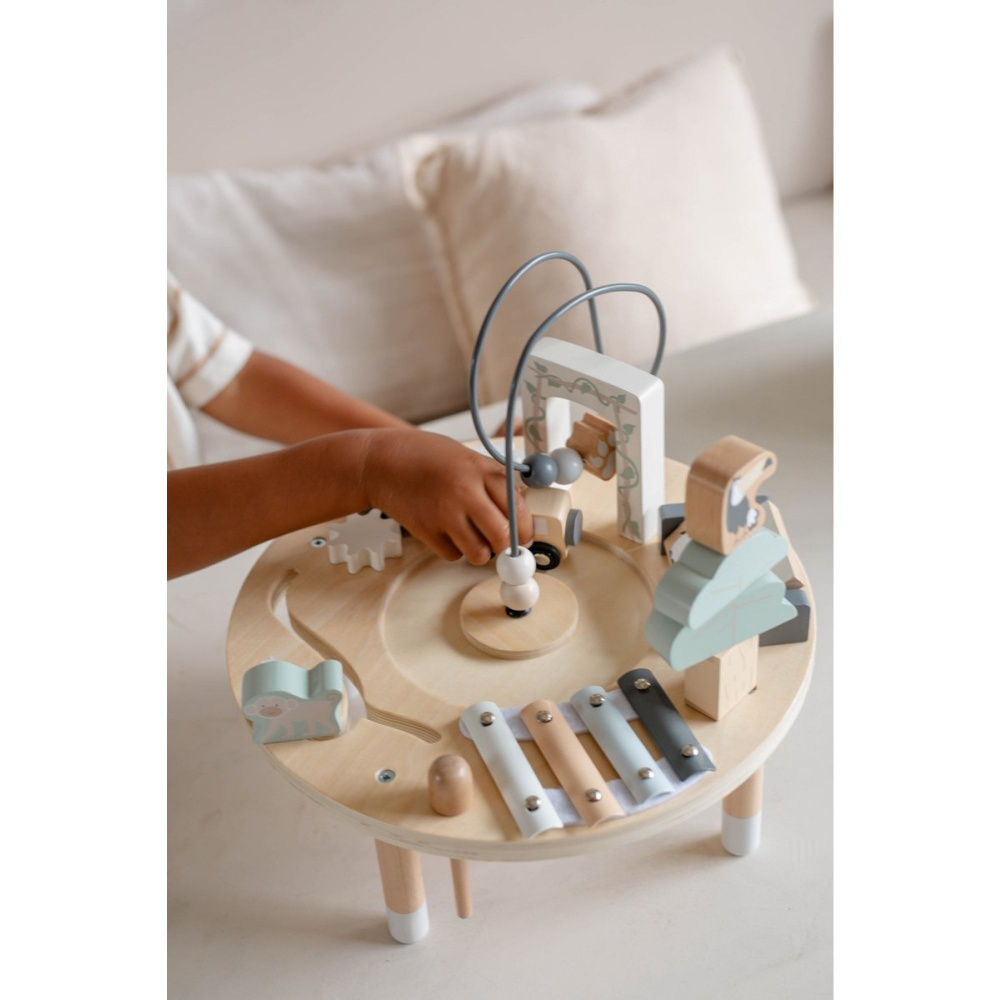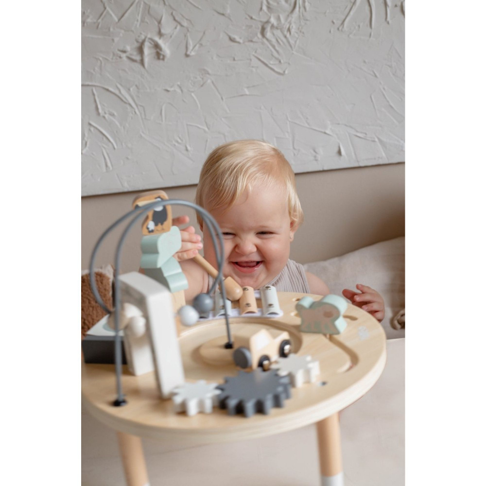 Découvrez la Table d'activités en bois 18 mois et + de la marque Tryco. Avec ses couleurs douces et son design raffiné, elle trouve facilement sa place dans la maison tout en proposant de nombreuses animations ludiques. Les petits découvriront un circuit pour voitures, un xylophone aux teintes vives, des blocs à manipuler, une spirale de perles et des engrenages à actionner. Chaque jeu favorise la découverte des formes, des couleurs et des sons, tout en développant la motricité fine et la curiosité des enfants.