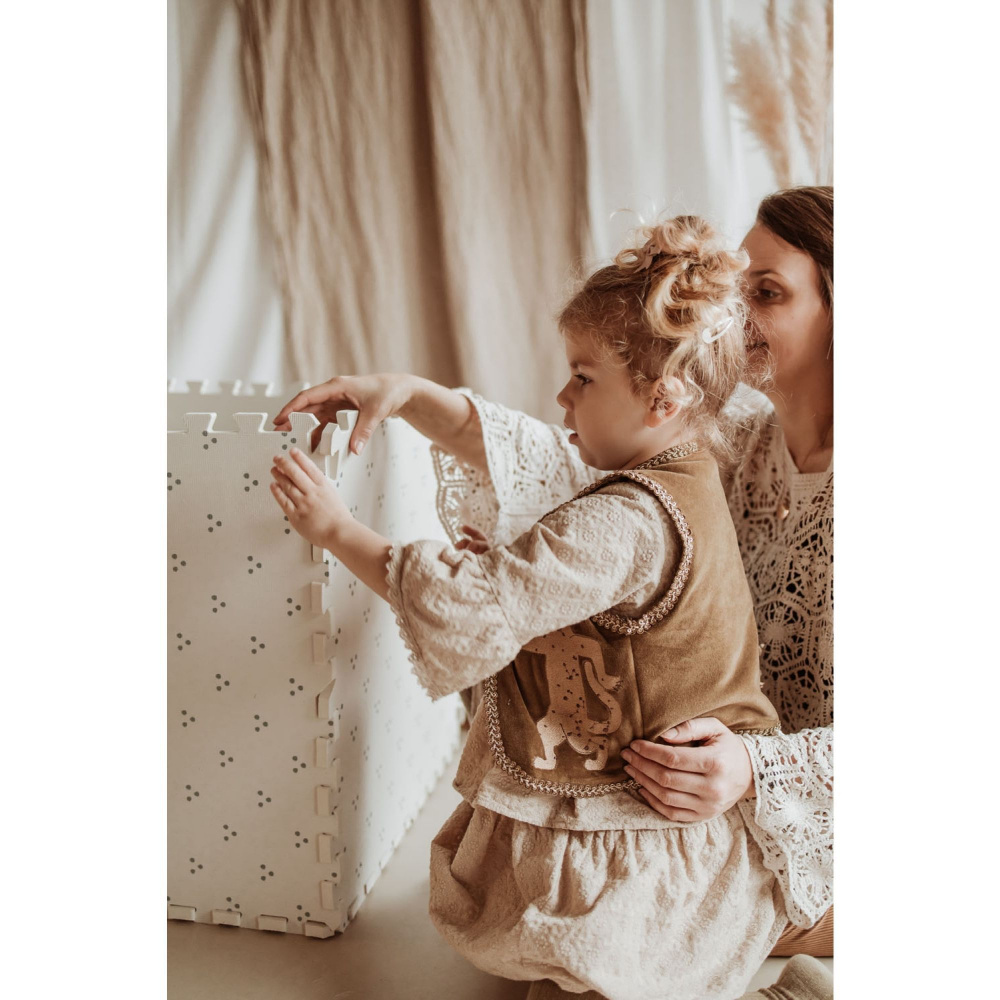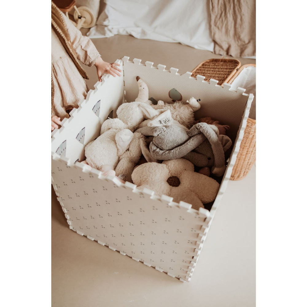 Ce tapis de jeu est réversible, il est imprimé des deux côtés pouvant offrir plusieurs univers de jeu à votre petit bout. Un côté ludique pour encourager le jeu et un côté qui développe l'imaginaire. Il s'assemblera comme un puzzle et pourra prendre la forme d'une cabane, d'une marchande ou même d'une boîte de rangement pour y ranger jouets et peluches.