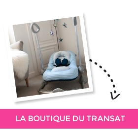 Le transat bébé balancelle est un transat installé en hauteur sur des pieds afin de permettre des mouvements mécaniques de balancement. Le siège du transat est réglable en différentes positions pour toujours s'adapter à la progression de l'enfant. La sécurité du nourrisson est assurée grâce à un harnais de protection et un siège qui maintient idéalement la nuque du bébé. Ce type de modèle est généralement muni de divers accessoires : arches de jeux, boîte musicale, vibrations du transat. Ainsi, le transat bébé balancelle est très complet et permet une utilisation régulière pour diverses activités. Il peut accompagner bébé pendant ses siestes, divertir bébé et grâce à sa hauteur vous pouvez donner à manger à votre enfant depuis son transat.