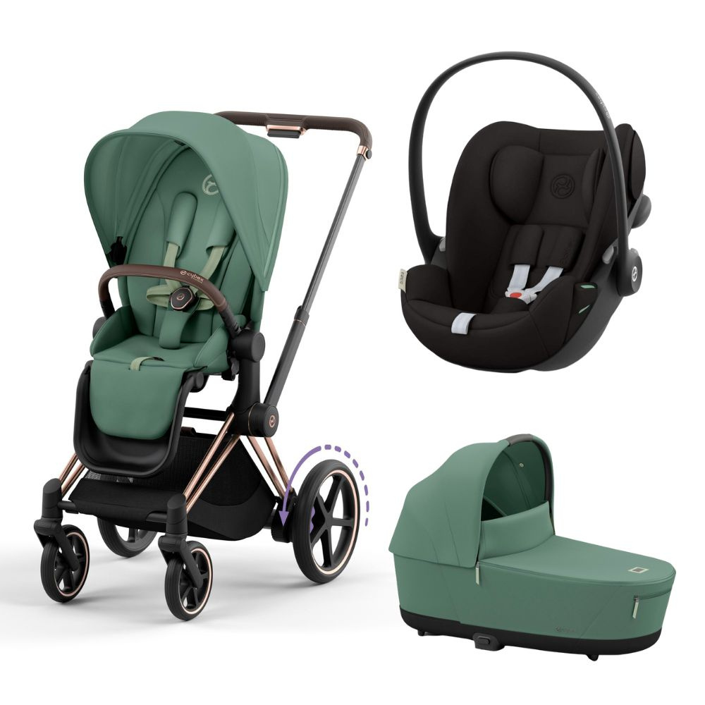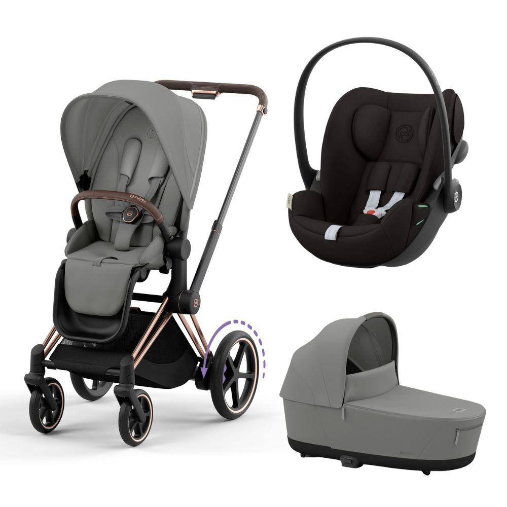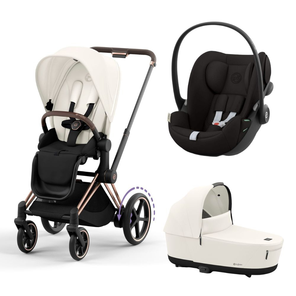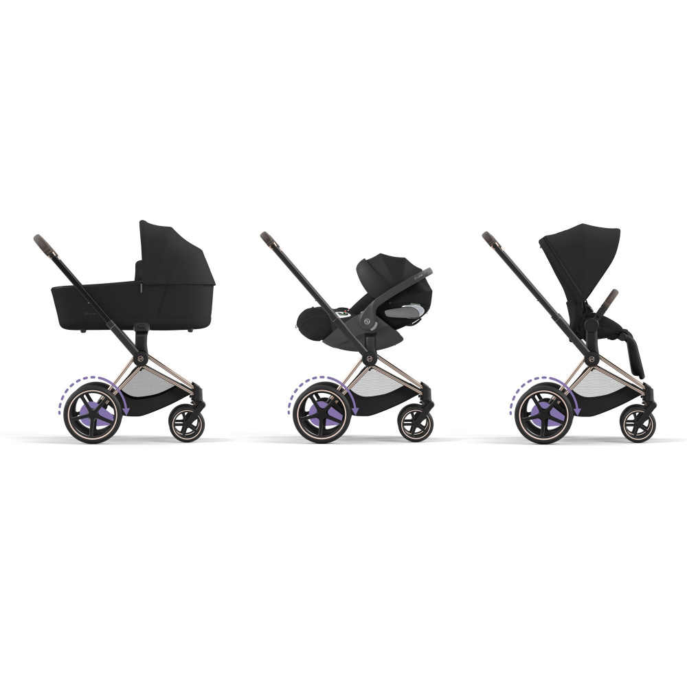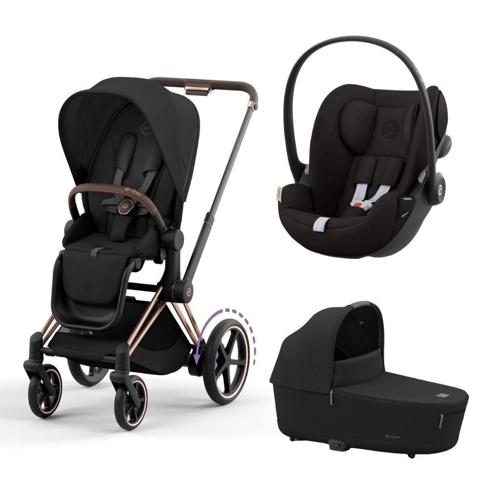 Adoptez la Poussette trio e-priam 2 sepia black châssis rose gold + cloud g i-size + nacelle de la marque Cybex. Composée de la poussette e-Priam 2, du siège auto Cloud G i-Size et de la Nacelle Luxe.