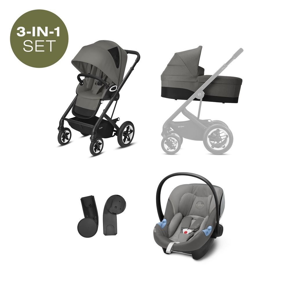 Découvrez le trio poussette Talos S Lux 3 en 1 de coloris gris, châssis noir, nacelle Cot S + siège auto Aton M i-size et adaptateurs de la marque Cybex Gold.