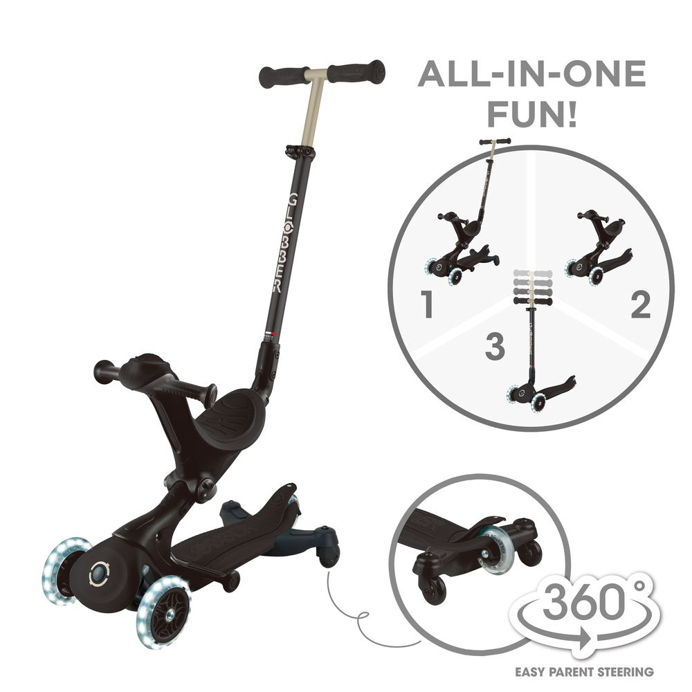 Découvrez la trottinette évolutive Go Up Deluxe Lights Eco 360 de la marque Globber. Cette trottinette est conçue pour accompagner votre enfant de 15 mois à 9 ans et plus. Grâce à son siège ergonomique et à sa barre de poussée en aluminium réglable sur 4 niveaux, elle garantit un confort optimal pour les enfants et une grande praticité pour les parents. Adaptée à chaque étape de son développement, cette trottinette évolutive permet un apprentissage progressif de l'équilibre et de la coordination. Son système de direction intuitif facilite la conduite pour les plus jeunes, tandis que ses poignées ergonomiques souples et durables assurent une prise en main agréable. Les roues lumineuses ajoutent un effet amusant, sans nécessiter de batterie, ce qui séduira particulièrement les enfants. Le mode trottinette est idéal pour les enfants plus grands, tandis que le mode draisienne les aide à développer leur autonomie et à préparer la transition vers une trottinette traditionnelle. Cette trottinette est fabriquée à partir de plastique 100 % recyclé, contribuant ainsi à la préservation de l'environnement.