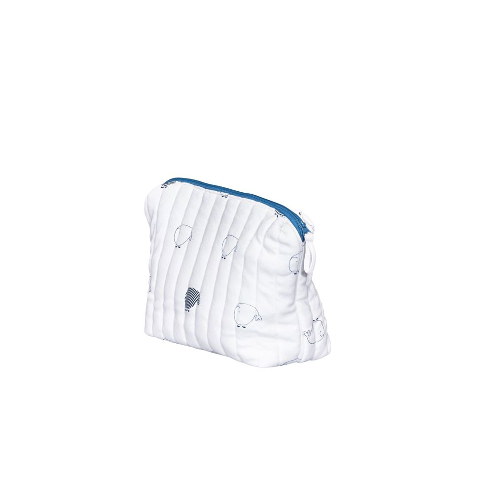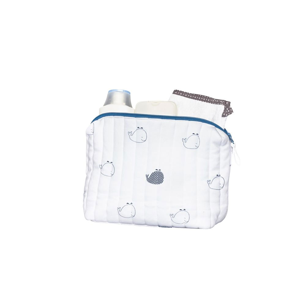 Cette Trousse de toilette bébé blue baleine en mousseline de coton bio est idéale pour y glisser l'essentiel pour la toilette et les soins de bébé lors de vos déplacements. Le tissu intérieur est déperlant et se nettoye facilement d'un coup d'éponge.