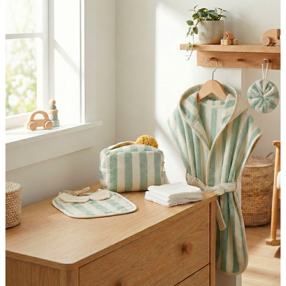 La trousse de toilette en bambou rayée ivoire/ vert de gris de BB&CO est un accessoire pratique et élégant pour transporter les essentiels de toute la famille. Avec son extérieur en éponge douce et sa doublure imperméable, elle protège efficacement son contenu tout en restant agréable à utiliser. Son format compact et son design intemporel en font un indispensable du quotidien comme des déplacements.