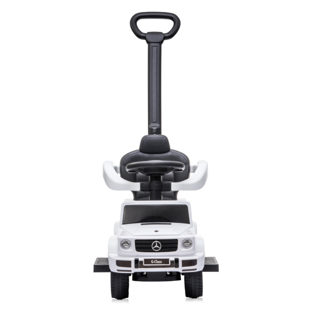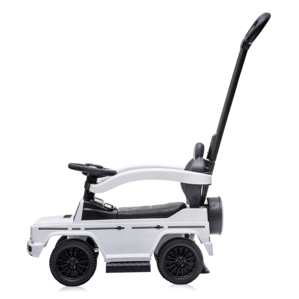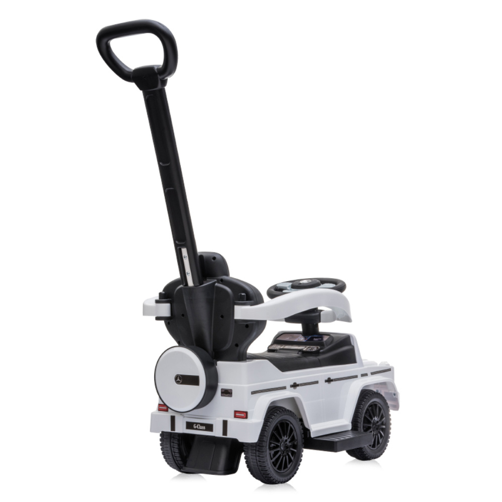 La Voiture à pousser mercedes-benz blanc Lorelli est un véhicule multifonctionnel 3 en 1 conçu pour les enfants de 12 à 36 mois environ, avec une capacité de charge maximale de 25 kg.