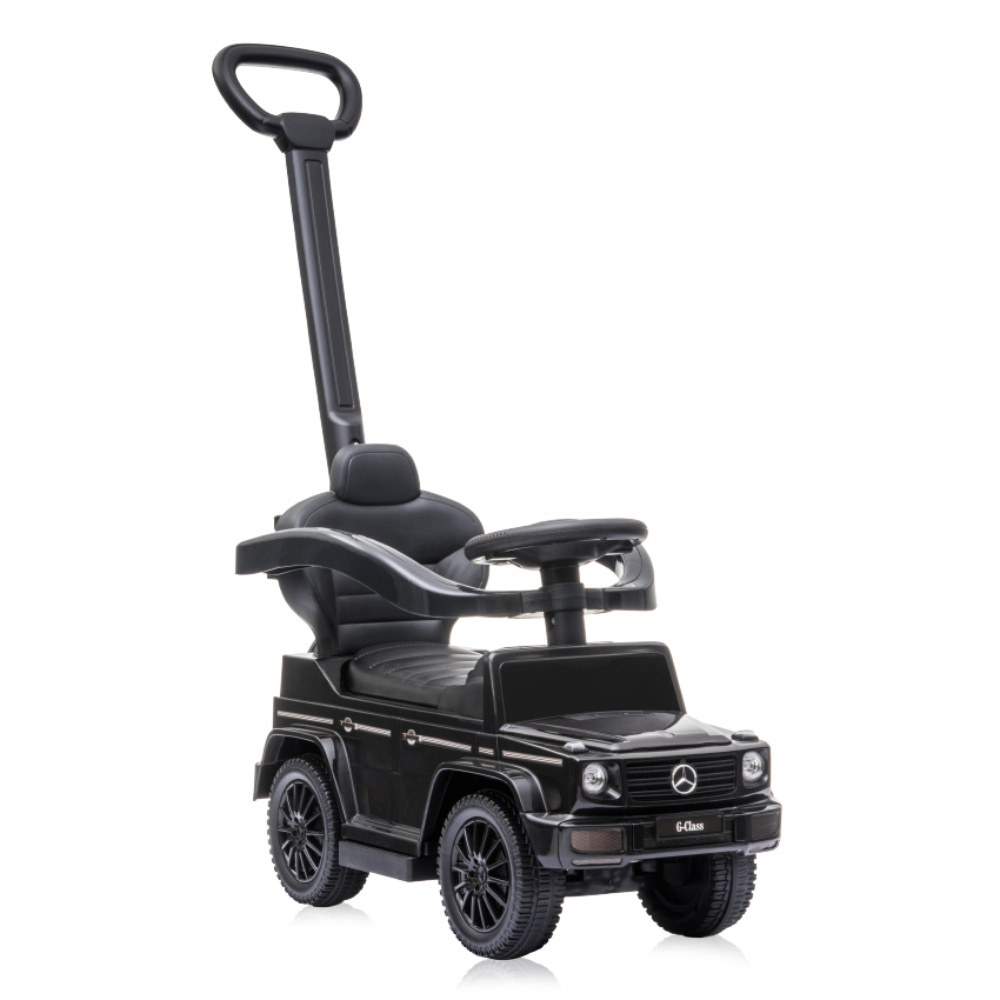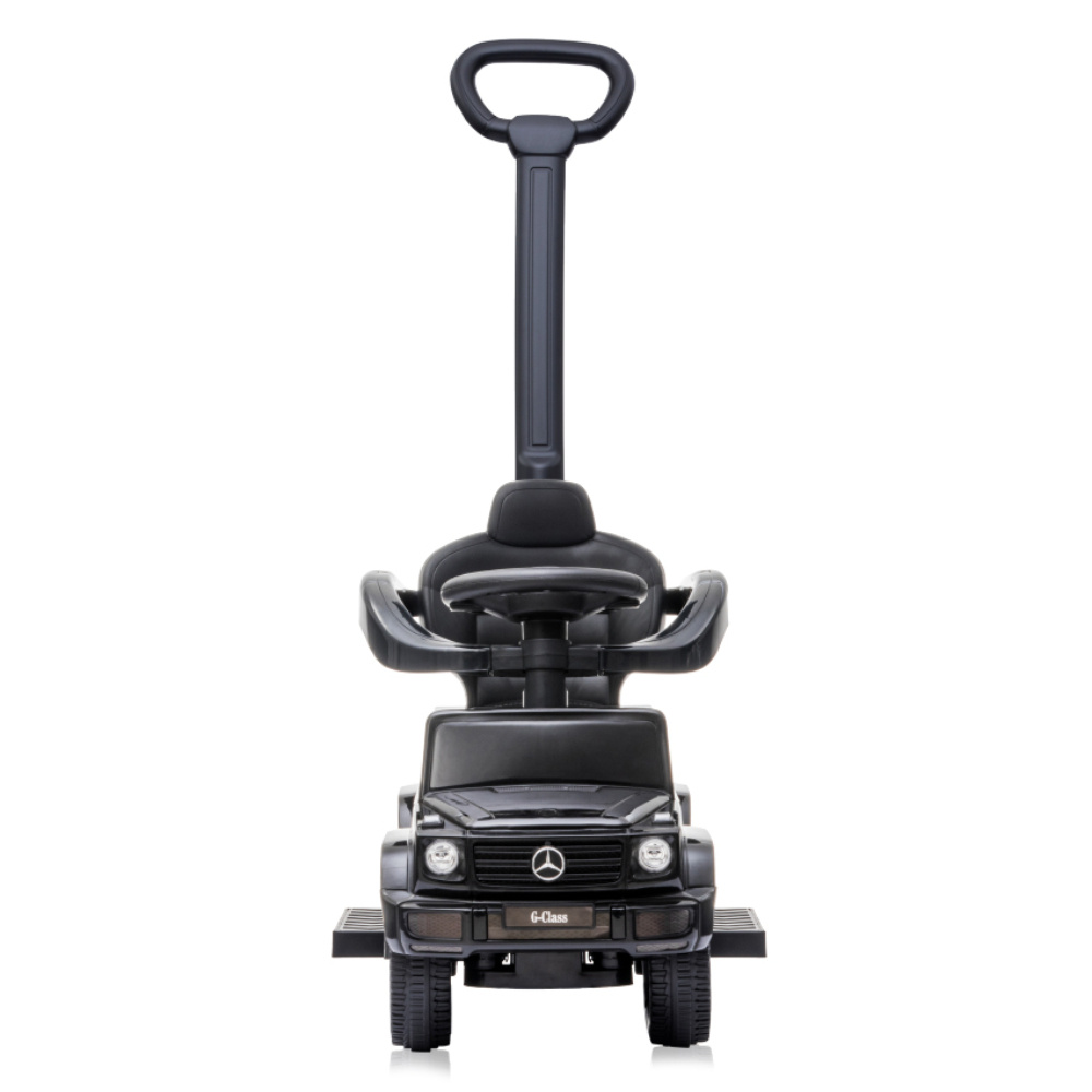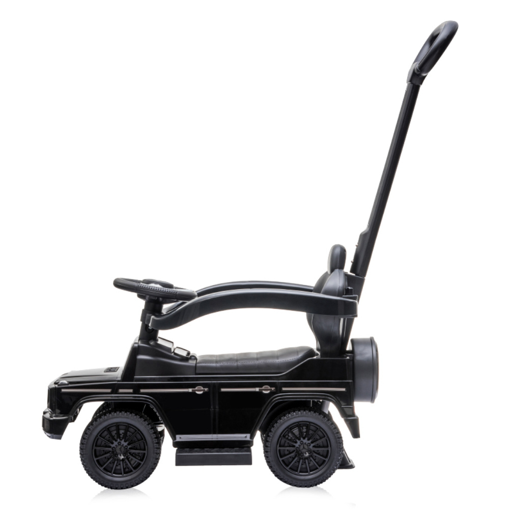 Cette voiturette arbore un design réaliste inspiré du légendaire SUV Mercedes Classe G, avec une finition soignée dans une élégante couleur noire. Elle est équipée d'un siège en plastique avec dossier ergonomique pour un bon maintien de l'enfant. La voiture dispose d'une poignée parentale pour diriger l'enfant lorsque nécessaire.